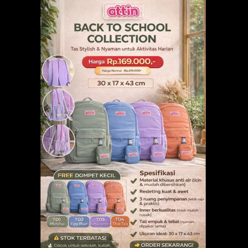 🎒 BACK TO SCHOOL ✨ Kolaborasi Attin x Erzet 🔥 PROMO SPESIAL PRE ORDER 📅 Pre Order: 9 – 25 April 2026 🚚 Estimasi Kirim: 15 – 20 Juni 2026 👜 SERIES A (A01–A05) 💰 Normal: Rp219.000 🔥 Promo: Rp169.000 Spesifikasi: • Material anti air (licin) • Resleting berkualitas • 4 ruang penyimpanan • Inner premium • Bantalan tali empuk & tebal • Ukuran 29 x 16 x 42 cm Warna: Chocolate | Sage Green | Steel Blue | Dusty Pink | Milk Creamy 👜 SERIES T (T01–T04) 💰 Normal: Rp219.000 🔥 Promo: Rp169.000 Spesifikasi: • Material anti air (licin) • Resleting berkualitas • 3 ruang penyimpanan • Inner premium • Bantalan tali empuk & tebal • Ukuran 30 x 17 x 43 cm Warna: Matcha | Egg Blue | Soft Lavender | Thai Tea 👜 SERIES E (E01–E03) 💰 Normal: Rp209.000 🔥 Promo: Rp159.000 Spesifikasi: • Material anti air • Resleting berkualitas • 4 ruang penyimpanan • Inner premium • Bantalan tali empuk & tebal • Ukuran 27 x 14 x 41 cm Warna: Blue Navy | Dark Black | Dark Grey 👜 SERIES R (R01) 💰 Normal: Rp209.000 🔥 Promo: Rp159.000 Spesifikasi: • Material anti air • Resleting berkualitas • 3 ruang penyimpanan • Inner premium • Bantalan tali empuk & tebal • Ukuran 28 x 14 x 41 cm Warna: Pure Black ⚠️ Note Penting: • Stock terbatas selama masa PO • Harga promo hanya berlaku saat periode PO 🛒 Order sekarang melalui Mitra Attin Jangan sampai kehabisan, karena ini BEST DEAL! 🚀